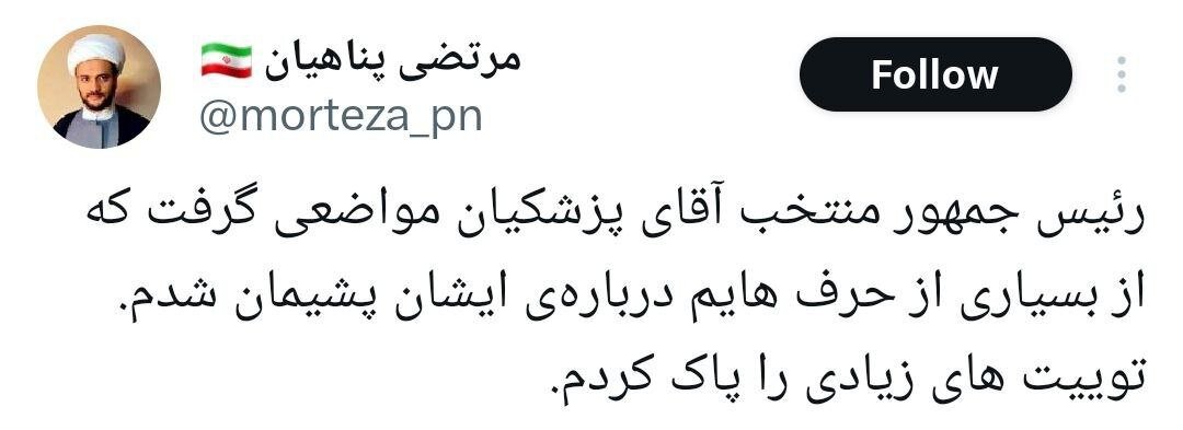 رئیس جمهور منتخب آقای پزشکیان مواضعی گرفت که از بسیاری از حرف هایم درباره ایشان پشیمان شدم. توئیت های زیادی را پاک کردم.